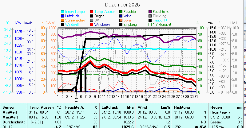 Standard Regen Abweichung laufendes Jahr tatsächlich Wert: -3.4 mm Max Regen/Tag 80.0 mm